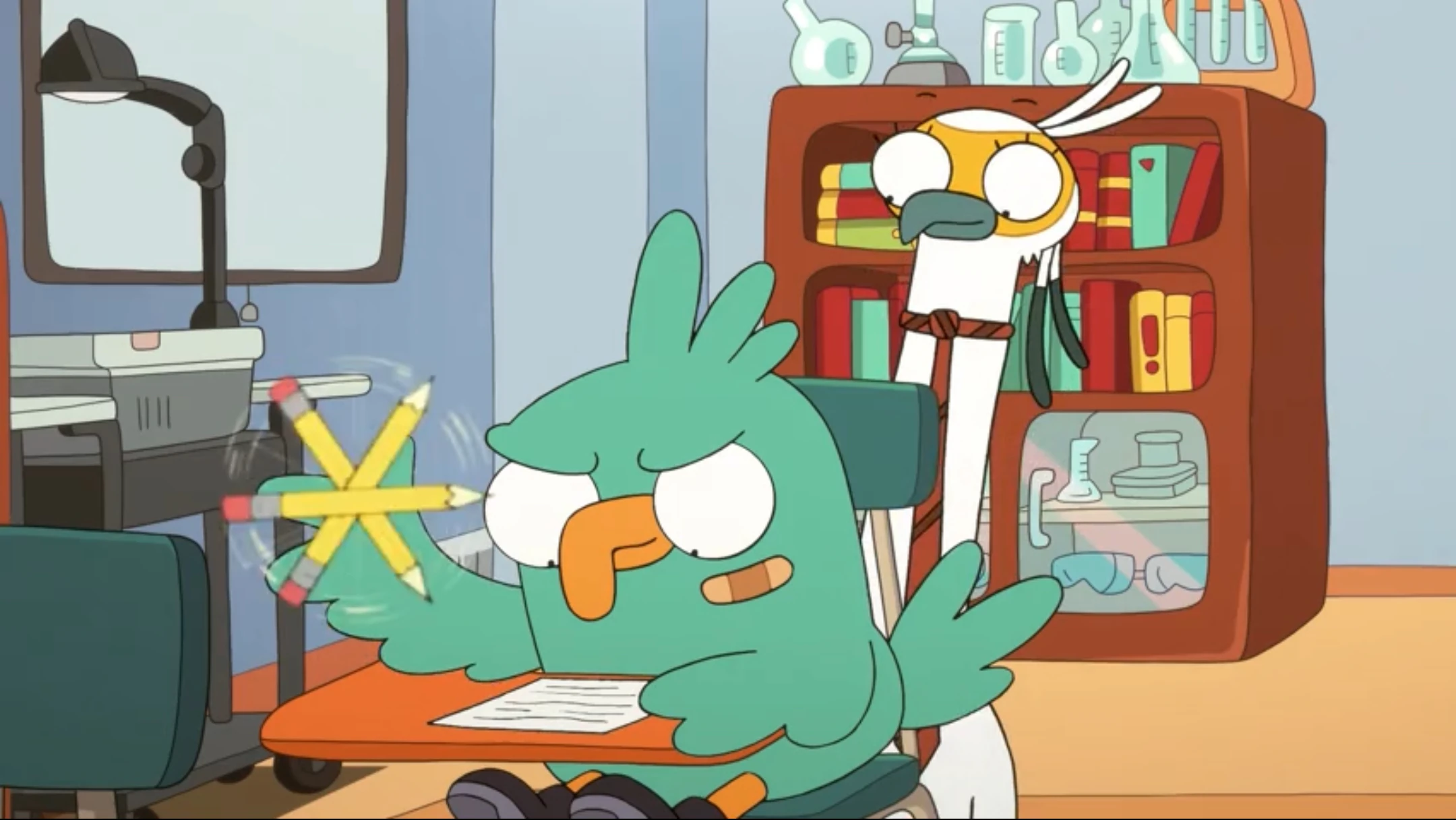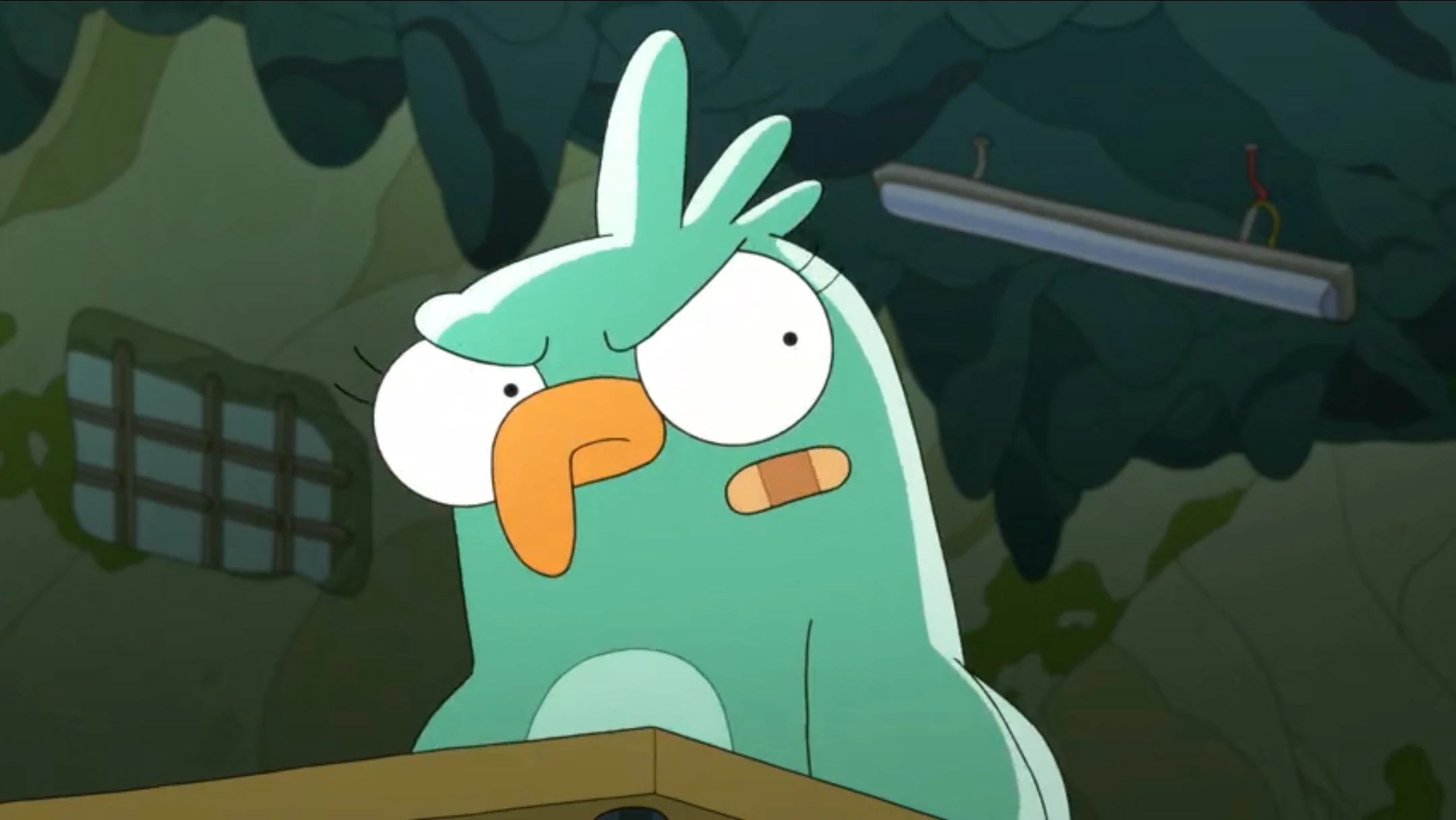 Amira is a teal bird with an orange beak. She has a bandage on her face and wears black boots.