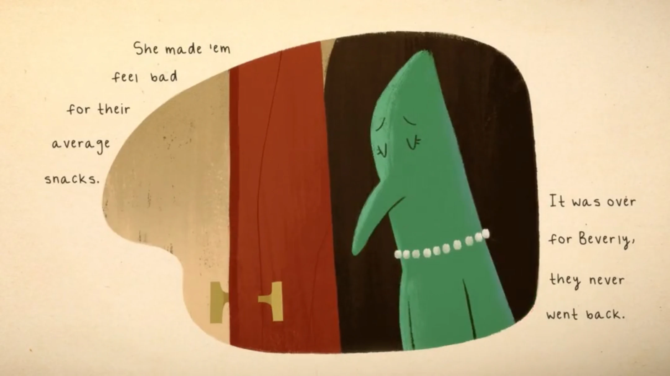 Beverly is a perfectionist when it comes to decorating. As a result of her perfectionism, she found herself banned from the Halfway There Day dinner crawl for overdecorating her house for the crawl, thus violating the principle of giving 50% effort on Halfway There Day. She then became an infamous figure around Table Town, rumored to be living in the mountains with crows as her only friends.