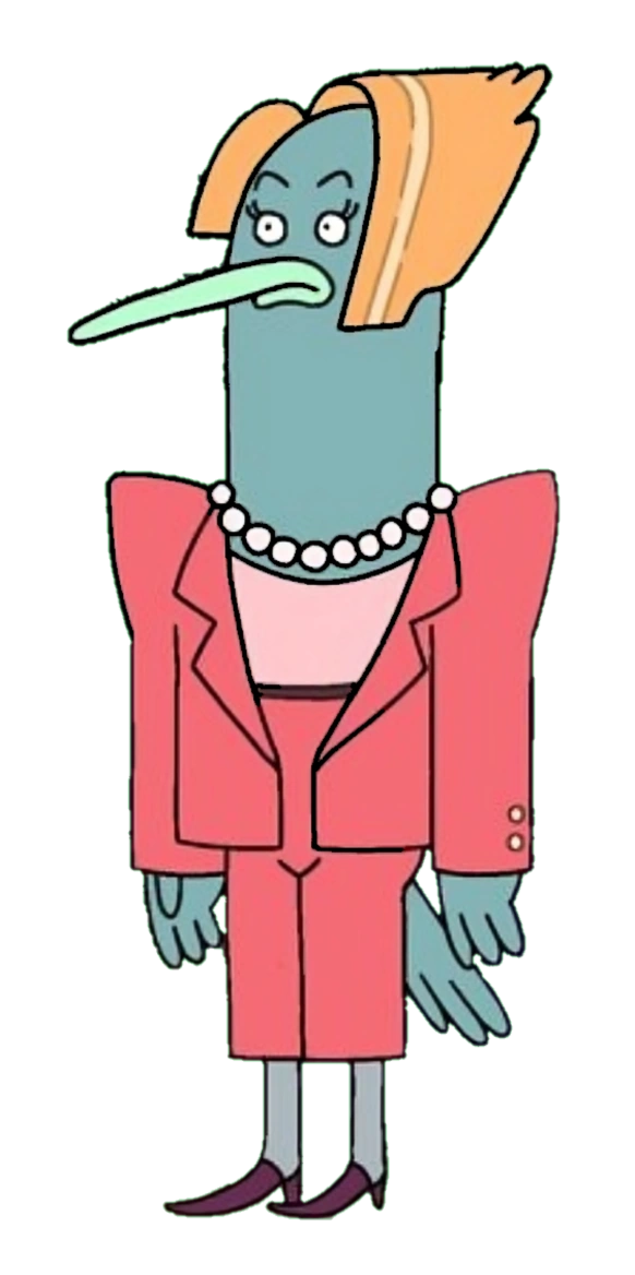 Beverly is a pigeon with blue-green feathers and blonde hair. She is typically seen wearing a pink pantsuit, a light pink shirt, a pearl necklace, and maroon flats.