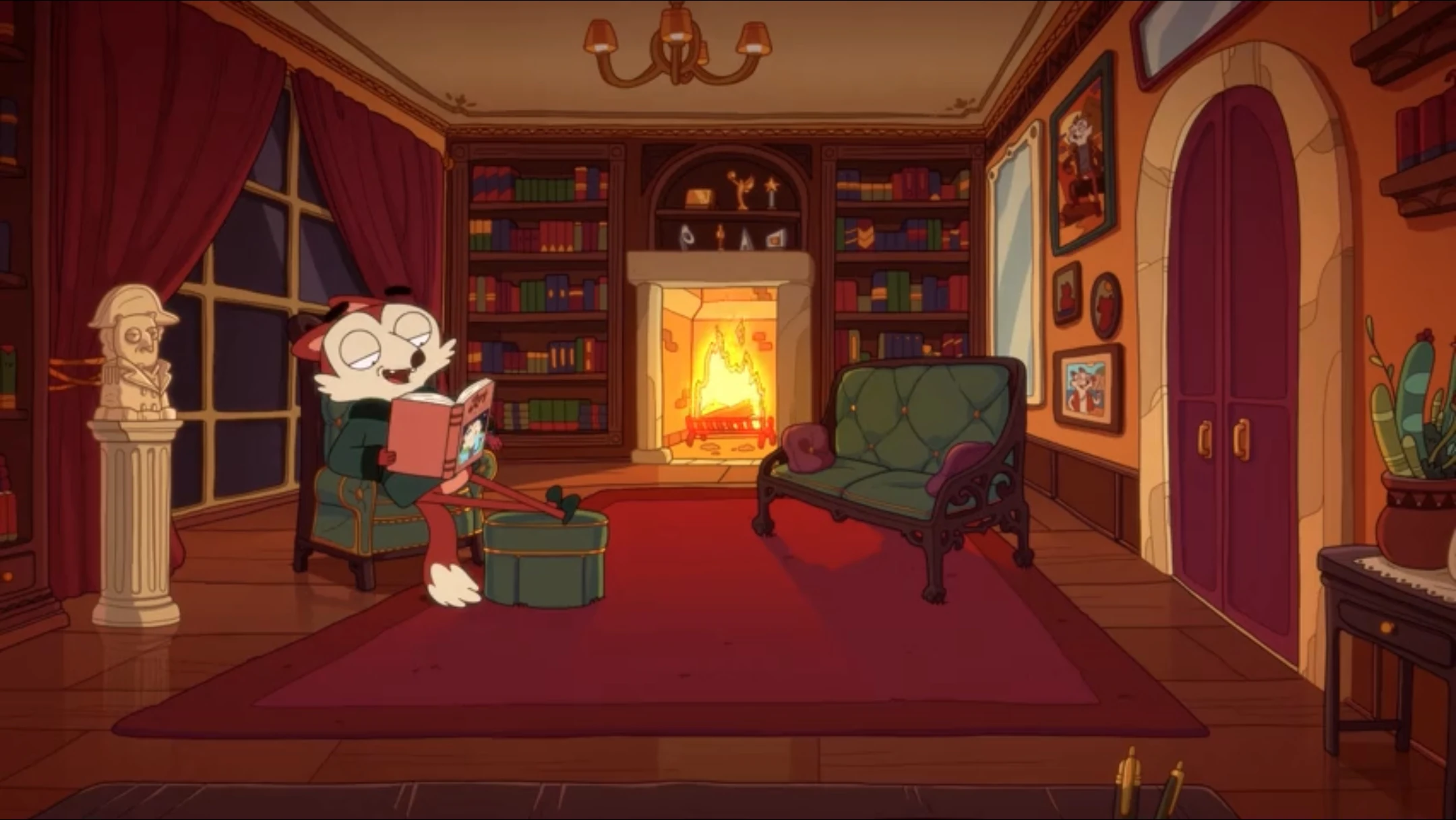 - In the foyer, a statue of Roy dressed like Indiana Jones can be seen.
