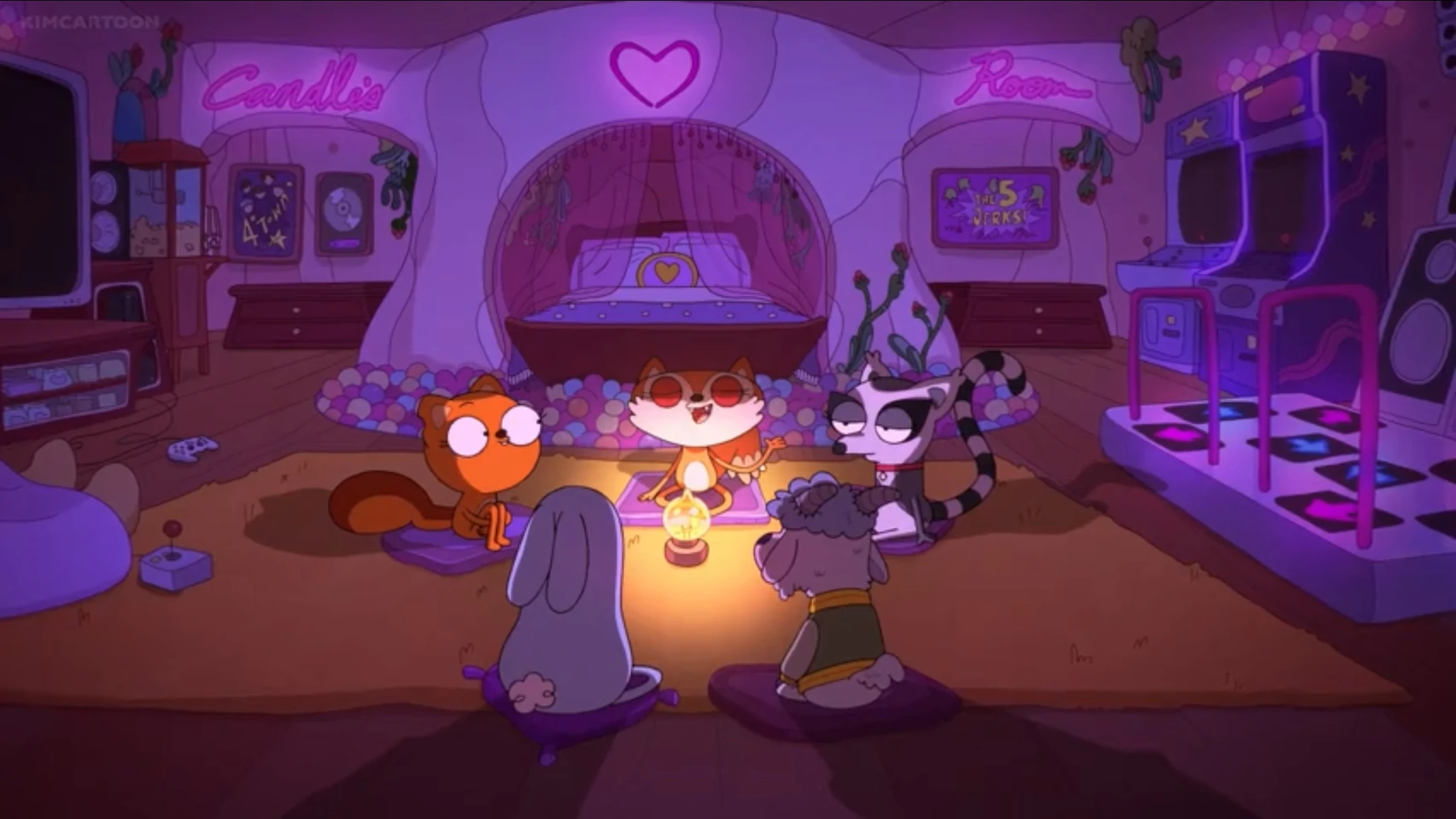 Candle's bedroom is found on the second floor. Inside, her bed is located within a spherical, cave-like nook decorated with curtains and neon signs, and is surrounded by a ball pit. The room also contains, among other things, a TV with a surround sound system, a video game console, arcade machines, a snack bar, and a popcorn machine, as well as a play area with a climbing wall and a slide.