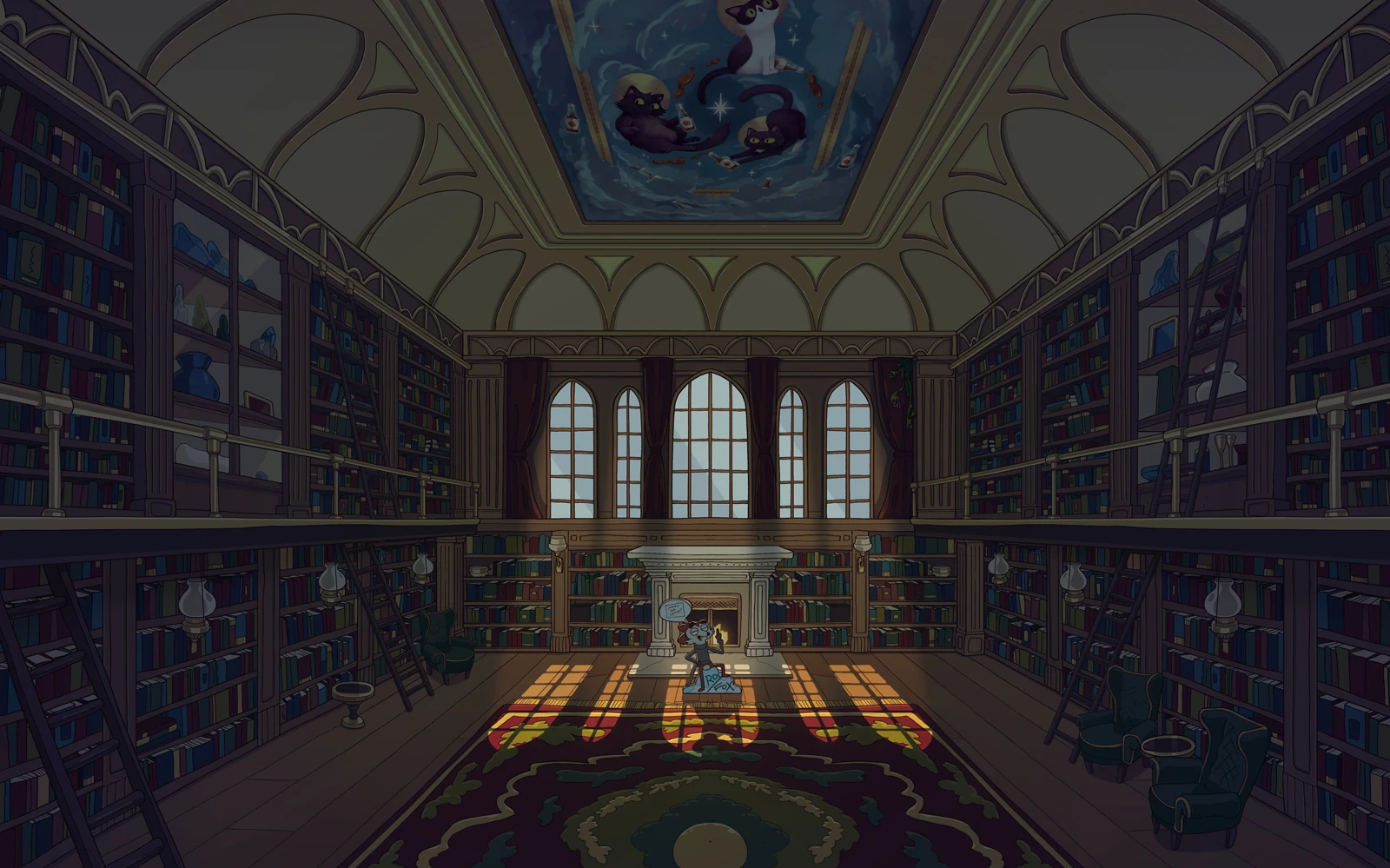 A large library is found on the second floor. The library's ceiling features a painted mural of three cats holding ketchup bottles, reflecting Roy's love of ketchup.