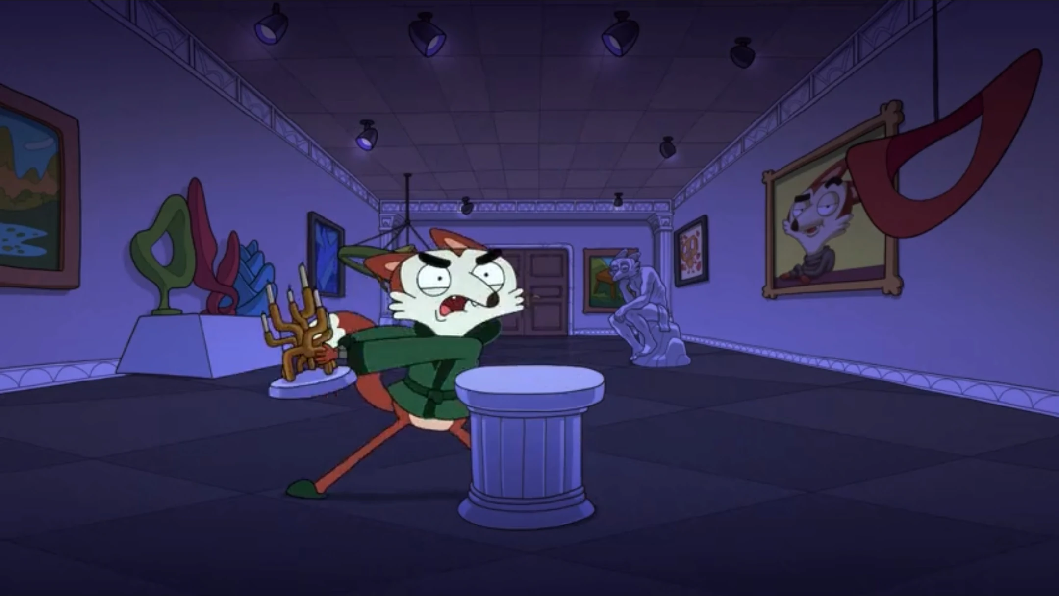 - In the art gallery, the artworks on display include a candle taped to a wall, parodying Comedian by Maurizio Cattelan; and a sculpture of Roy based on The Thinker by Auguste Rodin.