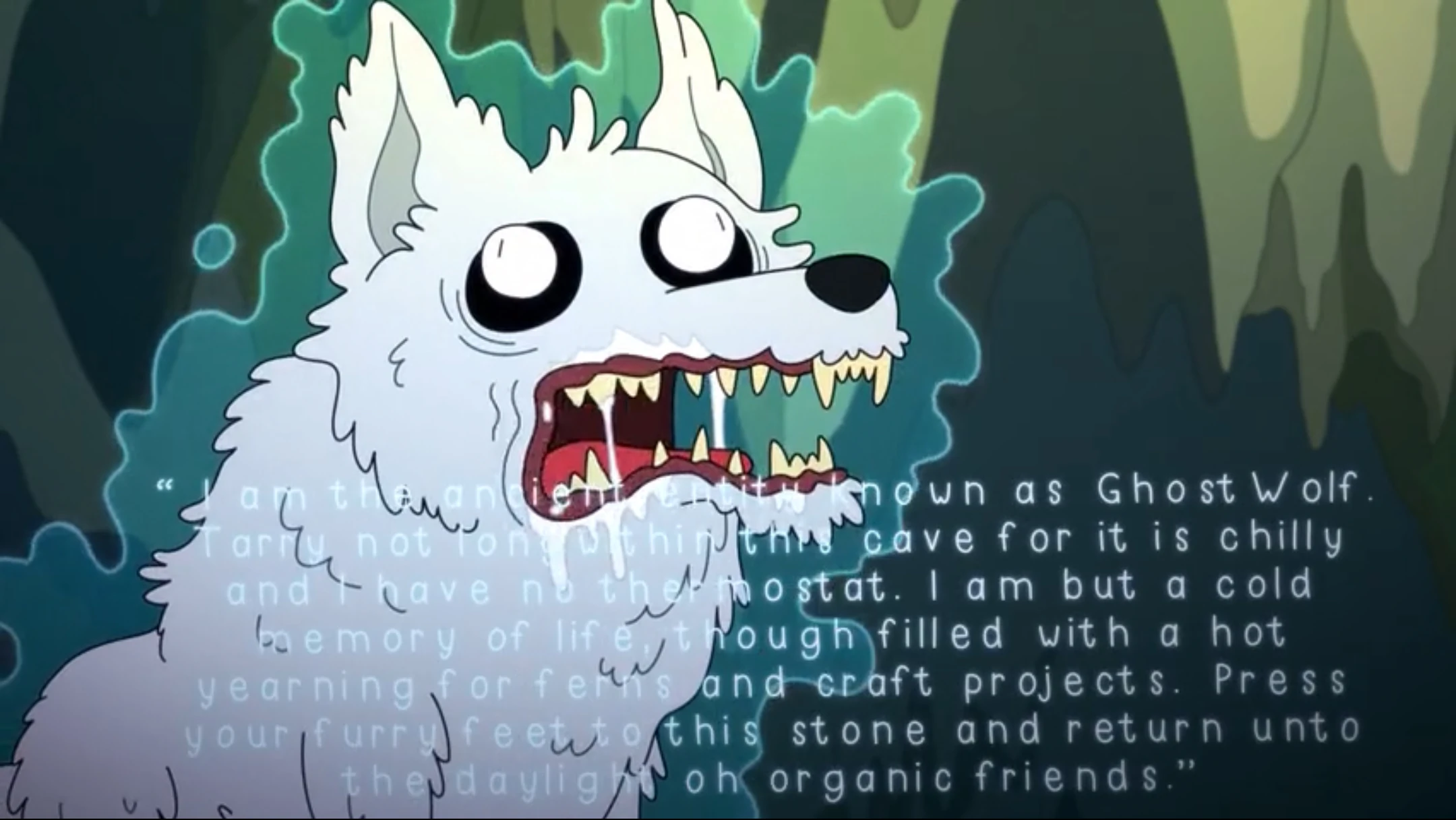 Although he seems scary at first glance, Ghost Wolf is actually a benevolent, mild-mannered creature. In "Totally Table Town", Kiff, Barry, and their friends encounter him on his mountain and flee from him in fear, but later discover that he only intended to give them back their lost wireless speaker. In this appearance, he communicates only in grunts and howls.