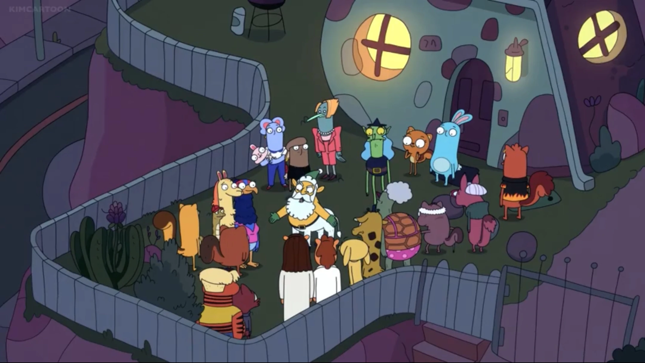With the situation resolved, the Halfway There Day celebrations continue. Centaur Claus brings out his magical garbage can, into which everyone throws slips of paper containing New Year's resolutions that they no longer intend on keeping. They then throw a party inside the Chatterley residence, while Centaur Claus watches from outside, satisfied. He reminds the viewers to go easy on themselves, then jets off into the sky on his garbage can.