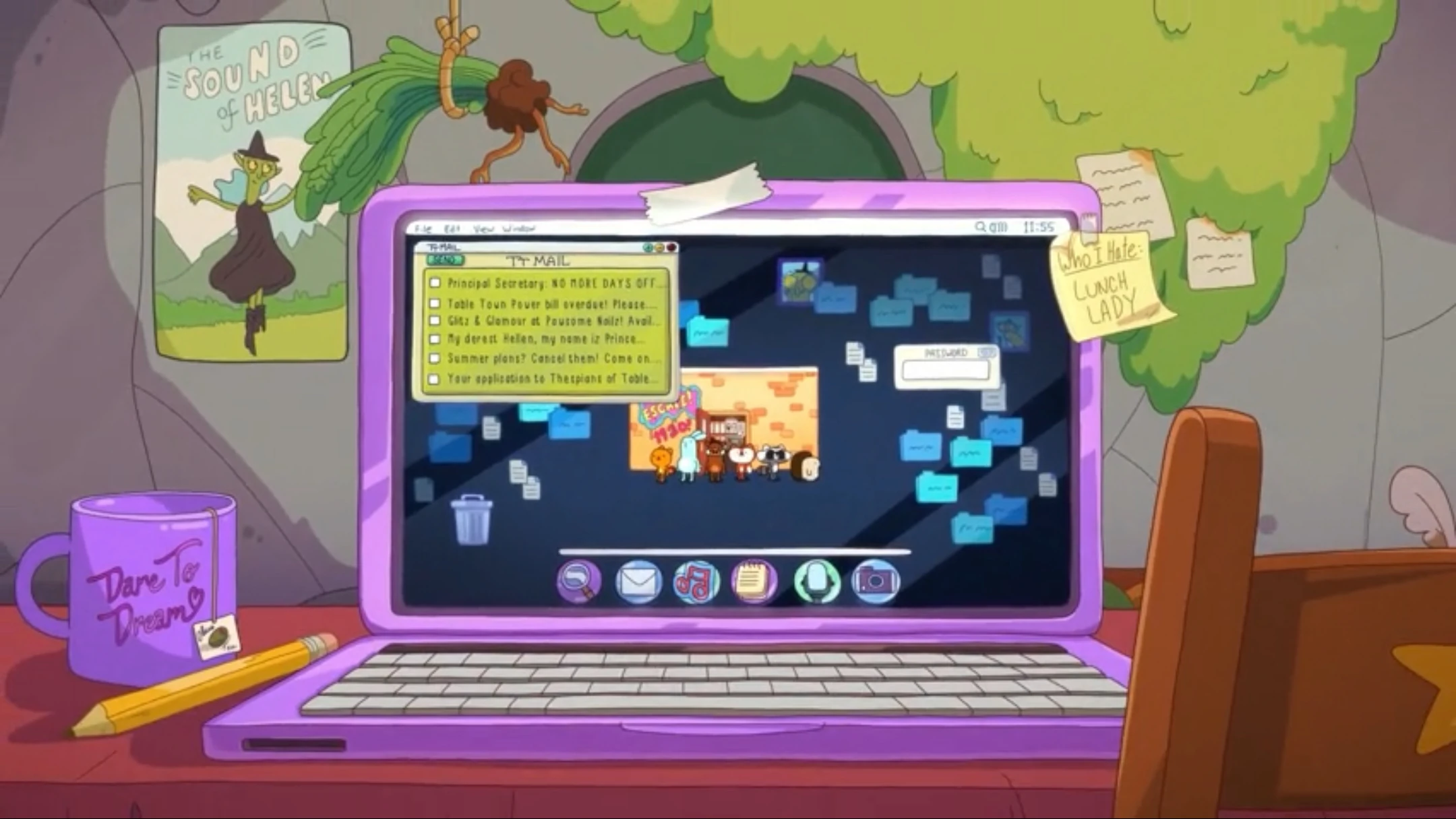 The children are alerted that Helen's computer battery is now at 5%. The gremlin tells them that if they are still in the computer when it shuts off, they will be rebooted and lose all their memories. Upon seeing Renée, who likes the computer's file deletion sound, stuffing files into the recycle bin, Kiff hatches an escape plan. The children fill the recycle bin with more files, creating a tall stack of deleted files. Kiff climbs the stack to reach the email window on Helen's desktop screen and email Principal Secretary for help. Reggie enters Helen's video editing program and stitches together various clips of Helen to create a video message asking Principal Secretary to rescue the children, which Kiff attaches to the email. Principal Secretary receives the email, but he sees that it is from Helen and instinctively deletes it without reading it.