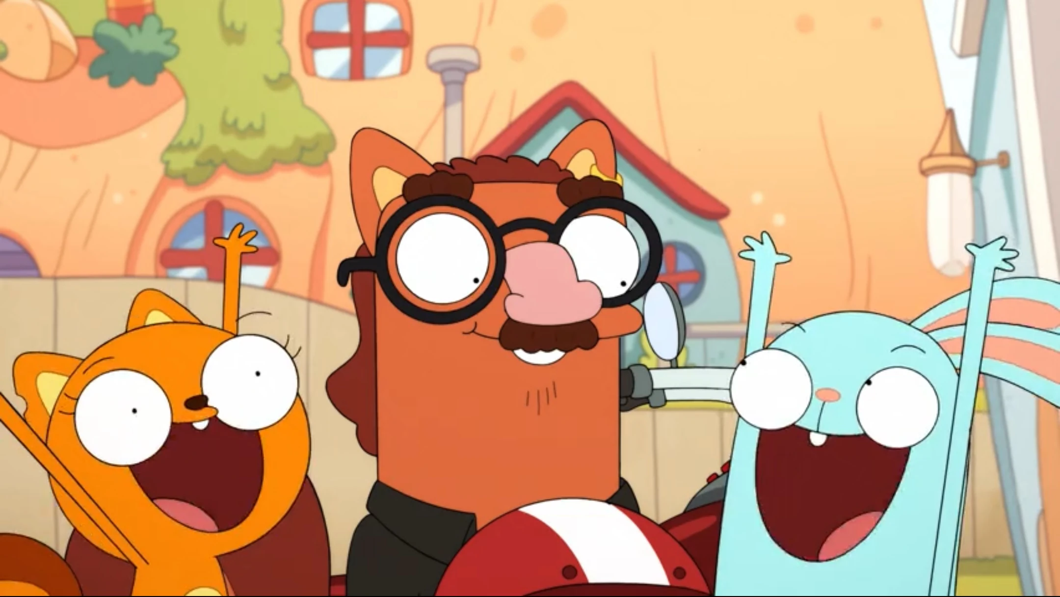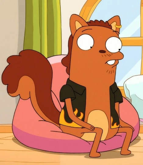 Pat is a squirrel with brown fur, long brown hair, and light facial hair. He typically wears a black collared shirt with a flame design, as well as an earring on his left ear.