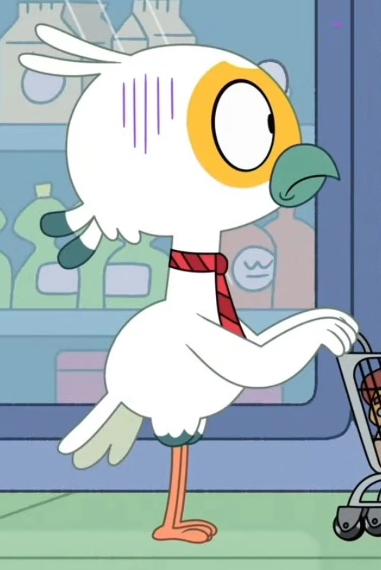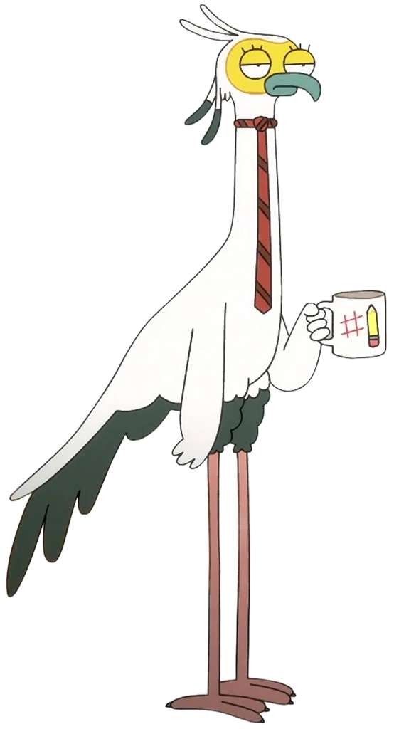 Principal Secretary is a secretarybird with white feathers that cover most of his body, as well as dark gray feathers on his upper legs and the bases of his head and tail. He has a dark yellow face, a gray beak, and long pink legs. For clothing, he is typically seen wearing a red tie with dark red stripes.