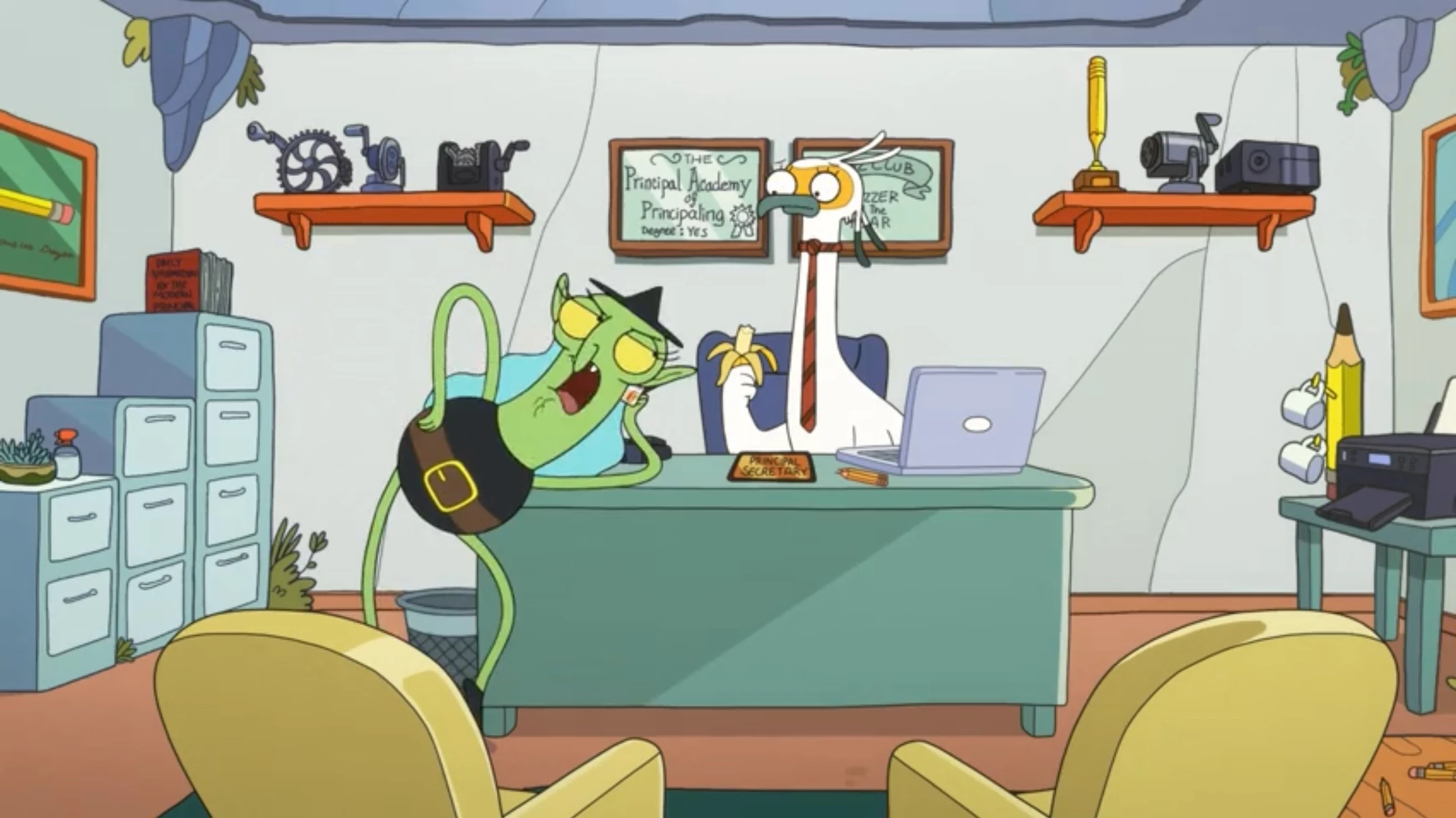 Principal Secretary entrusts Kiff and Barry with the task of sorting his outgoing mail for him every Friday while he goes out for his favorite Friday snack, a fruit cup from the Fruit-a-Go-Go food truck stationed outside Table Town Middle School – a routine the three call "Fruit Cup Friday". While sorting Principal Secretary's mail in "PS You're Fired", Kiff and Barry accidentally mail Secretary Mom an employment termination letter instead of a birthday card, creating a misunderstanding that eventually leads to Secretary Mom temporarily becoming the school's co-principal.