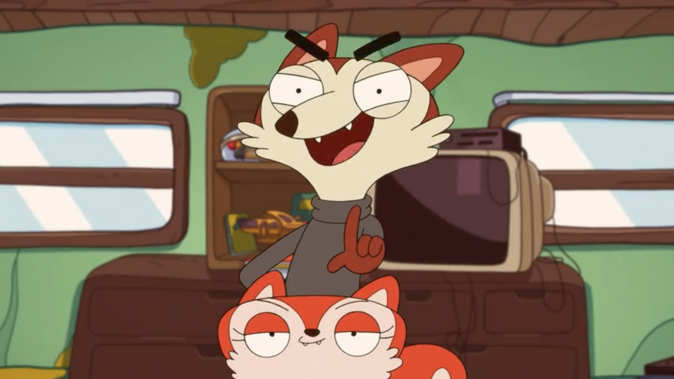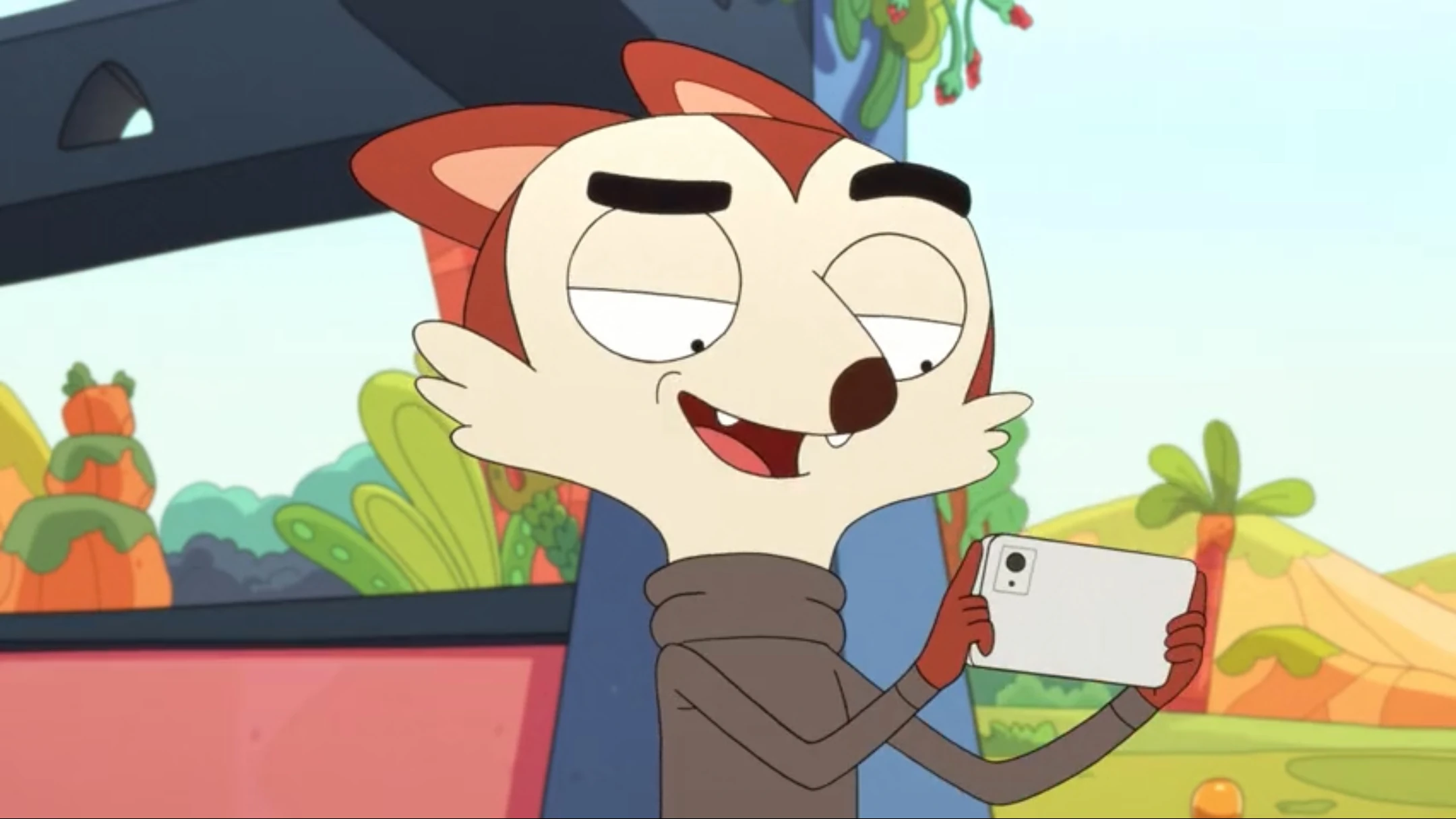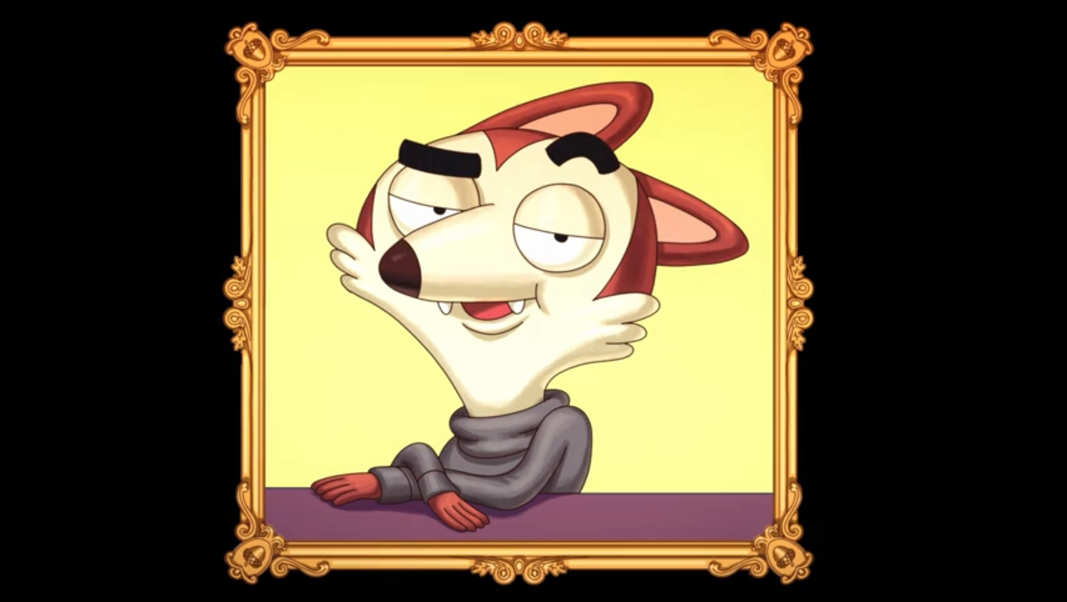 Roy is a fox with red fur, as well as patches of cream fur on his face and tail, and patches of light red fur on his stomach and the insides of his ears. He also has bushy black eyebrows, which are revealed to be fake in "Ghost Wolf's Art". For clothing, Roy is typically seen wearing a gray turtleneck sweater.