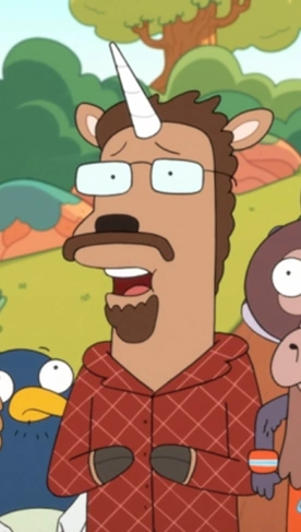Slent is a unicorn with a brown coat and a dark brown mane, tail, mustache, and goatee. He wears eyeglasses and a red plaid shirt.
