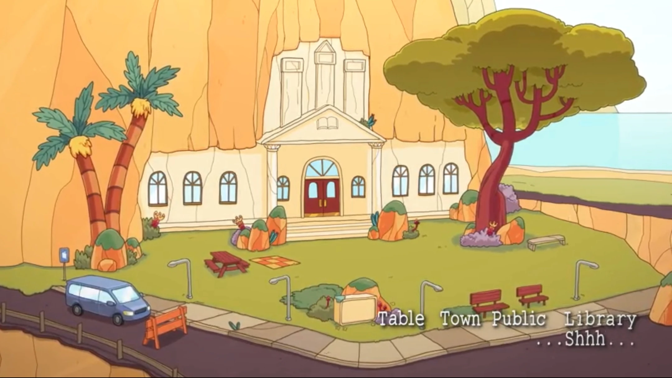 The Table Town Public Library is Table Town's local public library. Miss Moufflé serves as its librarian. The library has its own book club, of which Kiff, Barry, Renée, Reggie, and Patty are members.