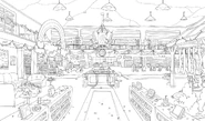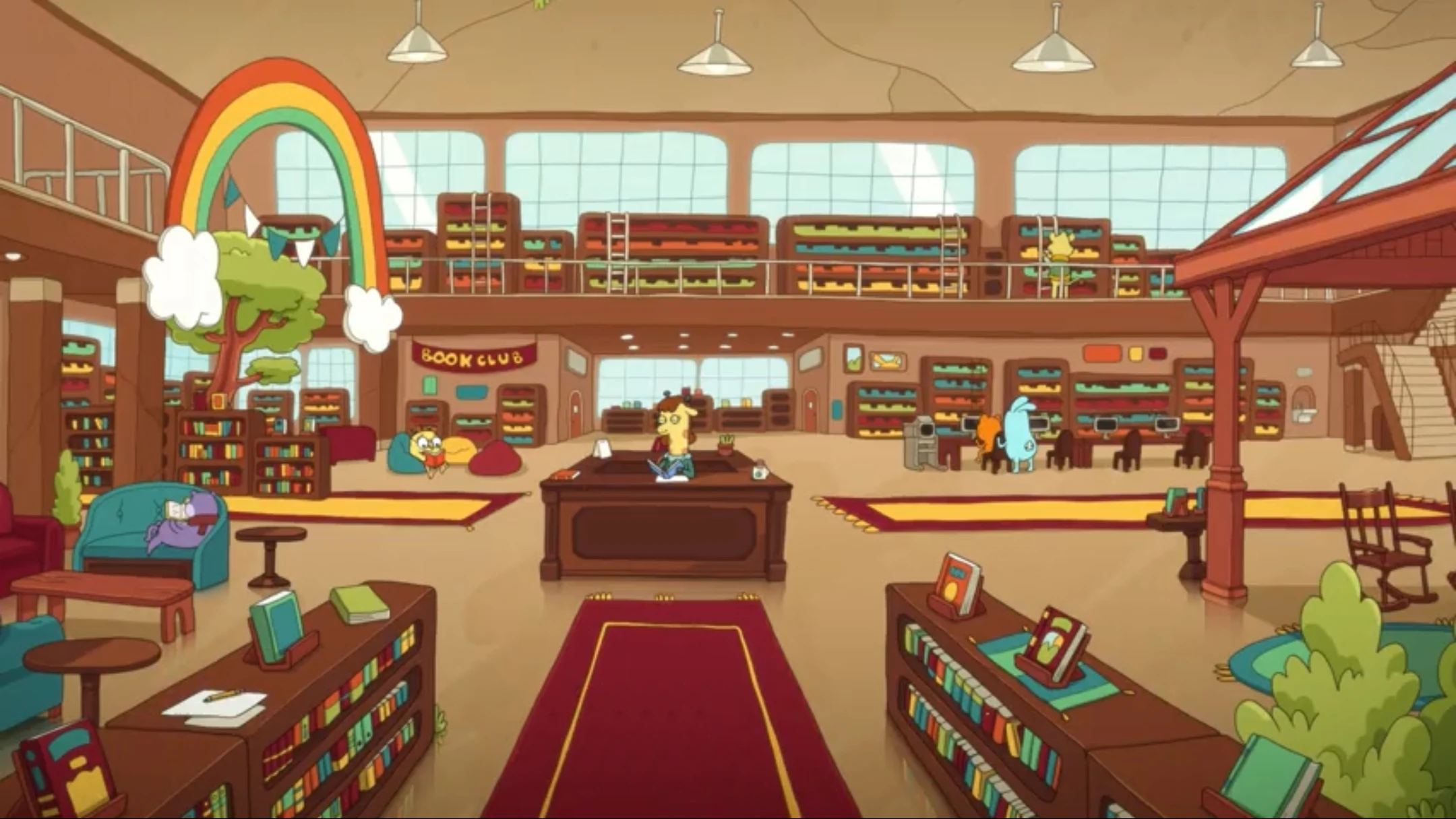 The main library area spans two floors. In addition to numerous shelves of books, it contains various reading areas and a computer area. Miss Moufflé's desk is found at the center of the first floor.