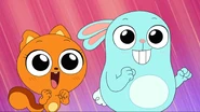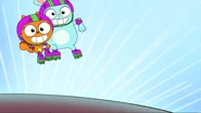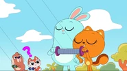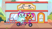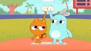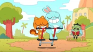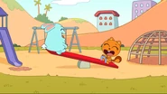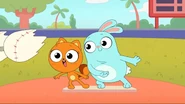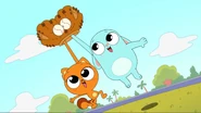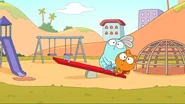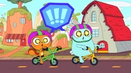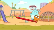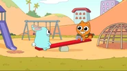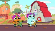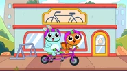 While riding their bikes, Kiff and Barry come across a tandem bike. The two get off their bikes and ride the tandem bike instead. Afterwards, they do even more tandem activities: paddling a tandem kayak, flying a tandem kite, eating cereal with a tandem spoon, bouncing on a tandem pogo stick, skating with tandem roller skates, playing baseball with a tandem ball, bat, and glove, and hula hooping together in the same hoop. Next, they try to seesaw in tandem by sitting together on the same end of a seesaw, only to realize that one of them needs to sit on the other end. Barry is at first disappointed to do so, but he and Kiff then have fun seesawing normally.