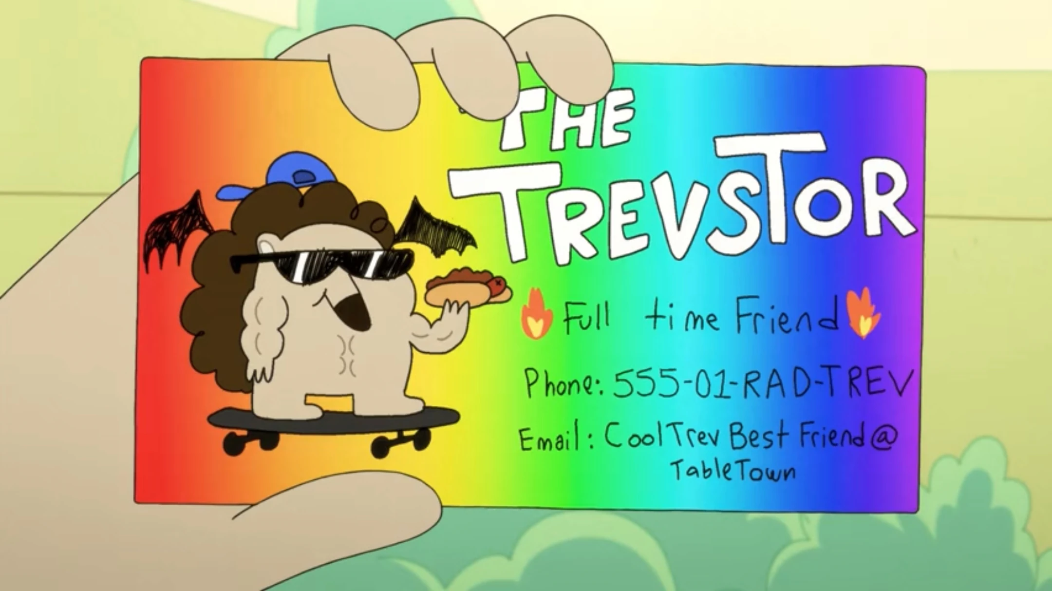 Trevor's relationship with Kiff and Barry is initially frictious. In "Kiff's Mix", he lies about having a brand new TV to convince them to visit his home and hang out with him, though when he admits the truth, the two do not mind and stay anyway. After Kiff creates a delicious cereal mix called Kiff's Mix in the kitchen, Trevor, seeing it as an opportunity for popularity, betrays Kiff by attempting to convince Barry to partner with him to mass produce and sell Kiff's Mix, despite Kiff's objections. When his plan falls apart, however, Kiff and Barry pity and comfort Trevor, who then apologizes for his actions. In "Friendiversary", Trevor double crosses Kiff again by trying to replace her as Barry's best friend, though he is again forgiven; in the episode, Trevor seemingly implies that he has a secret plan to intrude into Kiff and Barry's friendship, though this is never brought up again.